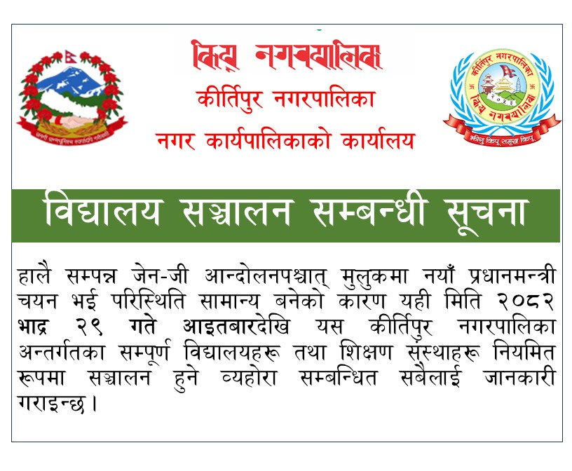 साँस्कृतिक र प्राकृतिक सम्पदायुक्त, शैक्षिक एवं पर्यटकीय शहर स्वच्छ हराभरा, समाबेशी तथा समुन्नत हाम्रो कीर्तिपुर नगर !